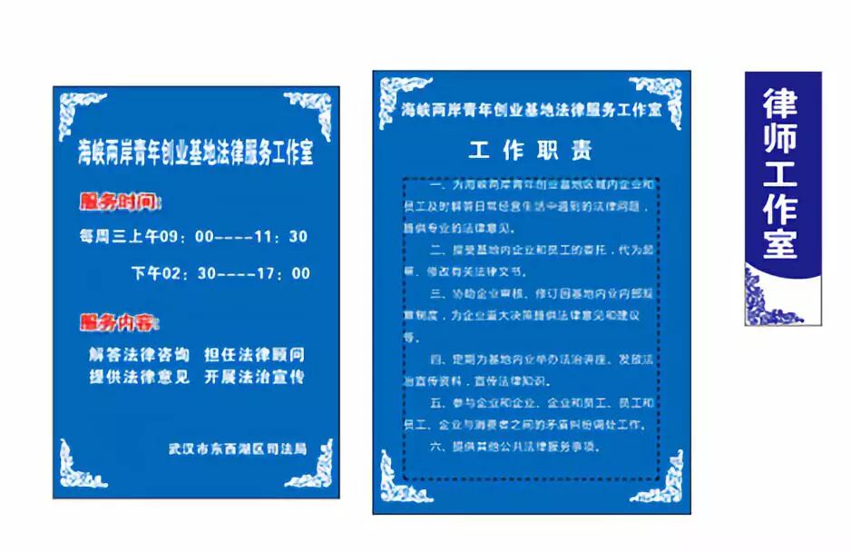 东西湖区司法局成立海峡两岸青年创业基地公共法律服务工作室,通过选派优秀律师每周三值班的形式,致力于为辖区台资企业开展针对性的法律服务,包括为来访企业提供法律咨询,对有聘用法律顾问需求的企业提供平台,建立律师服务企业微信群或QQ群在线答疑等。