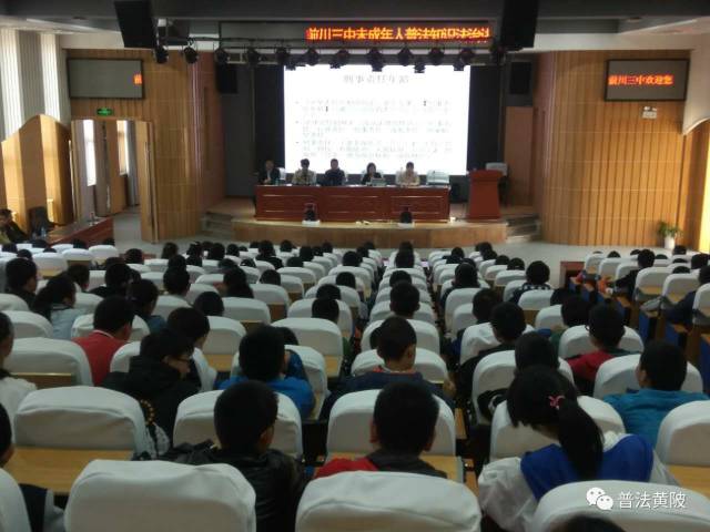 2017年11月9日,前川街司法所、前川三中在学校修远楼联合举办了“律师进校园,以案释法”活动,邀请知名律师徐素云为学校师生进行“未成年人犯罪的预防”法治讲座。学校师生近三百人参加了活动。