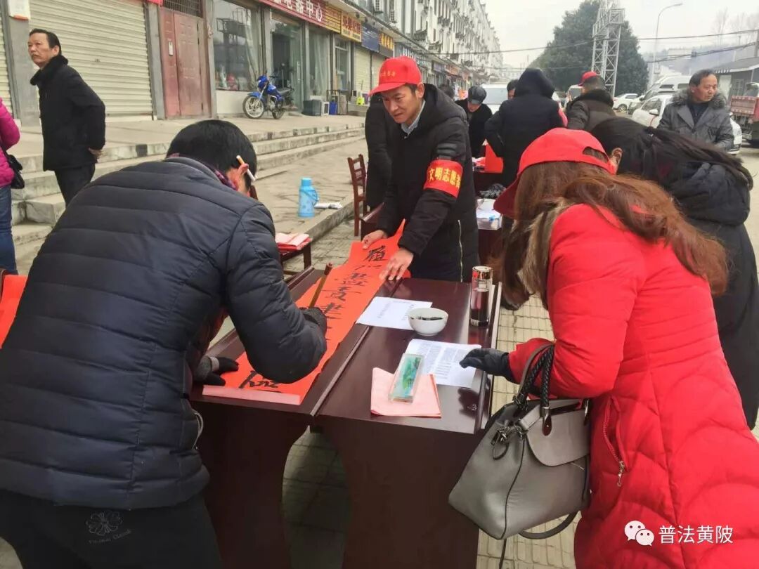 贴春联是中国老百姓迎春接福的传统习俗,利用春联普法不仅寓意深刻,而且让法治宣传更有活力。为了满足群众对法治文化的需求,不断创新普法宣传形式,丰富普法载体,在新春佳节来临之际,黄陂老年书法研究院的老师们到长岭社区和普法志愿者们一起在社区广场开展了“法治春联送祝福”的宣传活动。
