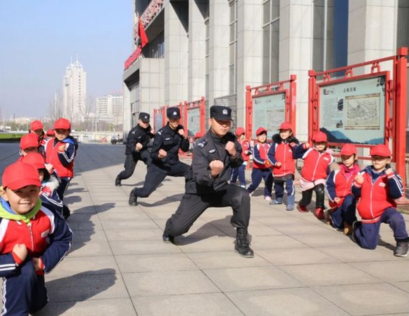 孩子们向三位特勤叔叔学习擒敌拳,一招一式,打得有模有样。